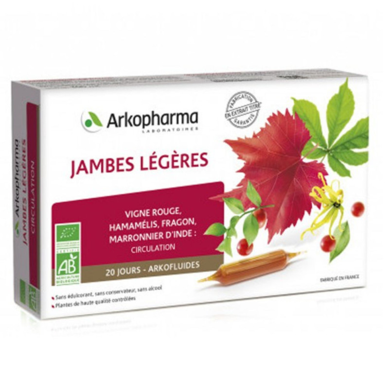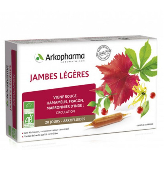 Arkopharma Arkofluides Jambes Légères Bio 20 Ampoules est un complément alimentaire ultra concentré à base de vigne rouge, d'hamamélis, de fragon et de marronnier d'Inde.
