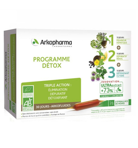 Arkopharma Arkofluides Programme Détox Bio est un programme complet triple action : élimination, dépuratif et détoxifiant. Il est composé de 3 étapes successives et complémentaires