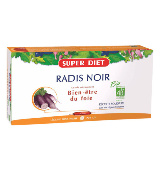 C'est en 1973 qu'a eu lieu la première extraction de notre pur jus. Cultivé en Normandie et dans le Nord de la France, selon les nomes de l'agriculture biologique, le Radis nois est récolté et pressé à froid dès son arrivée sur notre site : nos équipes vous garantissent ainsi un pu jus bio. Le Radis noir des Laboratoires SUPER DIET est le témoignage d'un savoir-faire authentique.