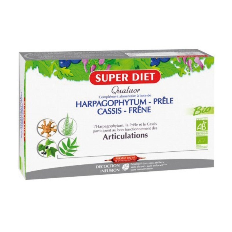 Ce quatuor est un extrait fluide associant 4 plantes, l’Harpagophytum et le Cassis sont reconnus pour leur action bénéfique sur le fonctionnement des articulations. Ils sont associés à la Prêle et au Frêne qui complètent à merveille de complexe. Fabriqué dans nos ateliers sans alcool – sans colorant – sans conservateur