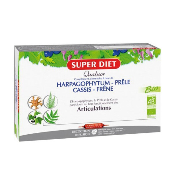 Ce quatuor est un extrait fluide associant 4 plantes, l’Harpagophytum et le Cassis sont reconnus pour leur action bénéfique sur le fonctionnement des articulations.