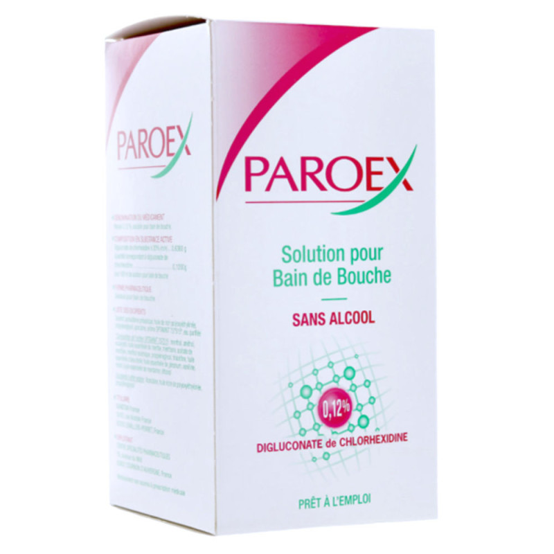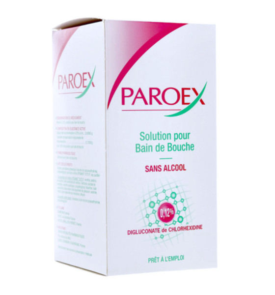 Le médicament Paroex bain de bouche est un traitement local d'appoint destiné à prendre en charge les infections de la bouche ou destiné en soins après une intervention chirurgicale de la cavité buccale, sans alcool. Paroex est disponible en flacon de 300 ml.