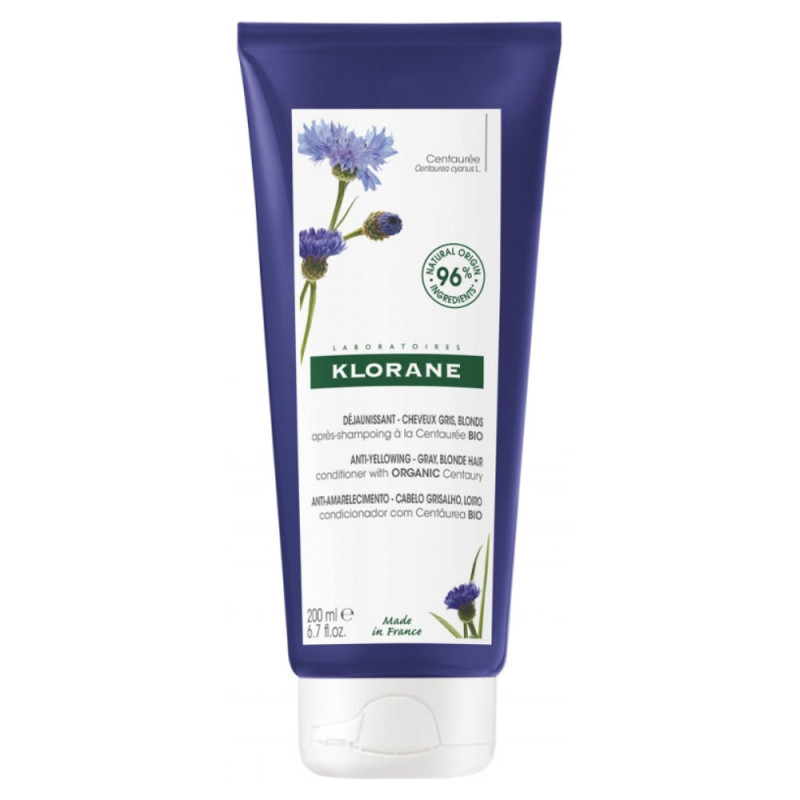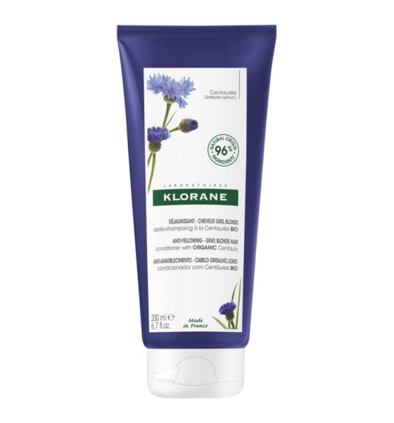 Klorane Déjaunissant - Cheveux Gris, Blonds Après-Shampoing à la Centaurée Bio 200 ml est un après-shampoing haute tolérance qui neutralise les reflets jaunes et cuivrés des cheveux blanc, gris et blonds platine dès la première utilisation. Il apporte de délicats reflets argentés aux cheveux, démêle et nourrit en profondeur.