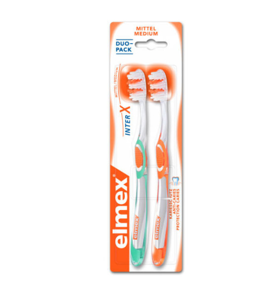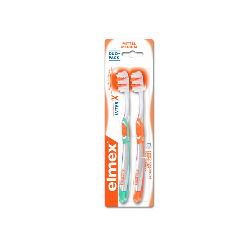 Tête ovale composée de rangées de brins blancs courts implantés en escalier et d'1 rangée.de brins oranges plus long implantés en X. Manche flexible ergonomique avec butée de préhension antidérapante. Dimensions : diamètre des brins blancs, 20/100 mm, diamètre des brins oranges, 17/100 mm. Coloris : translucide et orange. Conditionnement : carte blister.