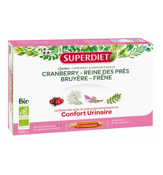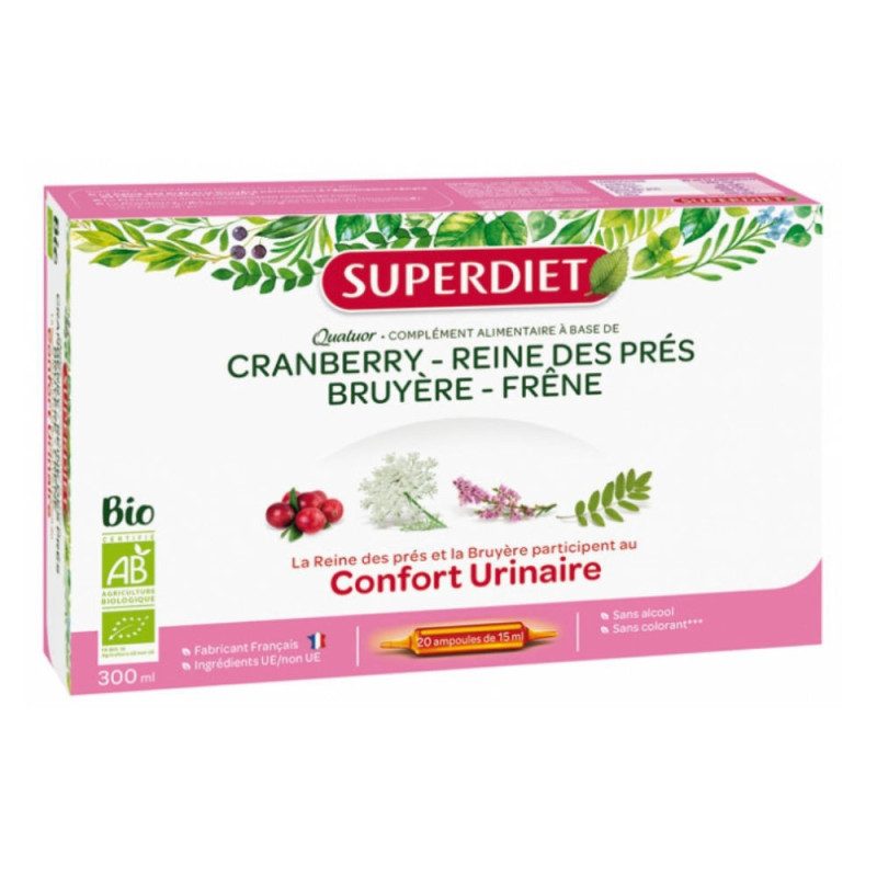 Super Diet Quatuor Reine des Prés Confort Urinaire Bio 20 Ampoules est un extrait fluide associant 4 plantes bio pour améliorer le confort urinaire.