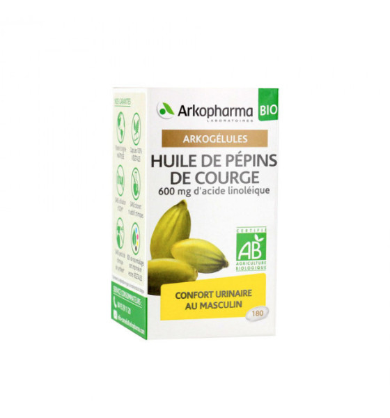 Arkopharma L’Huile de pépins de Courge bio 180 arkogélules, issue de l’agriculture biologique et obtenue par 1ère pression à froid, favorise le confort d’élimination urinaire chez l’homme.