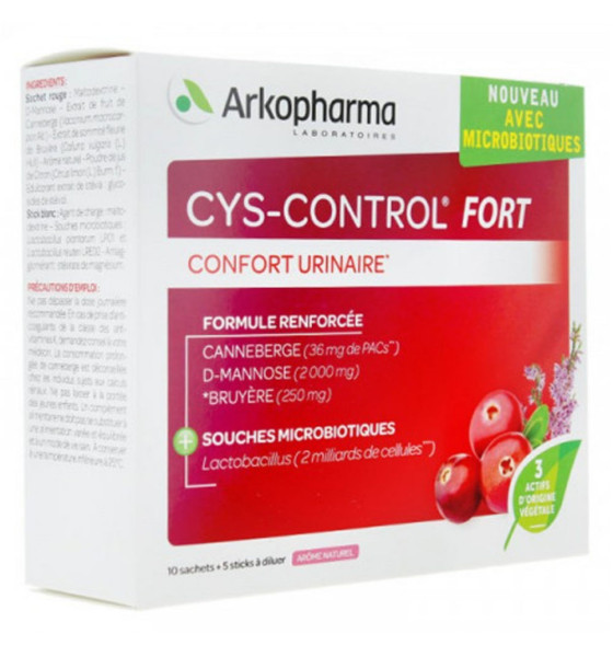 Cys-Control Fort 10 sachets + 5 sticks à diluer est un complément alimentaire du laboratoire Arkopharma à base de D-mannose, d'extrait de fruit de canneberge, d'extrait de sommité fleurie de bruyère et de souches microbiotiques (Lactobacillus plantarum LP01 et Lactobacillus reuteri LRE02).