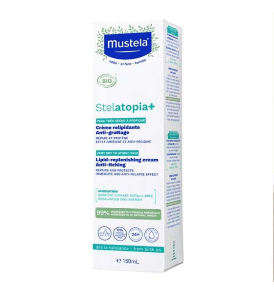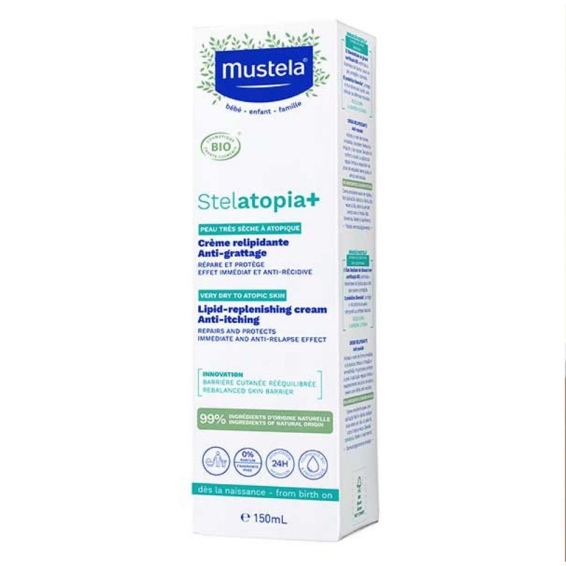 La Crème Relipidante Stelatopia + de MUSTELA est une crème anti-grattage certifiée biologique qui apaise les peaux sèches à très sèches et les peaux à tendance atopique. Ce soin hydratant et relipidant renforce et rééquilibre la barrière cutanée pour aider les peaux à se défendre naturellement et plus fortement. Rapidement, la peau est hydratée et plus douce. La crème relipidante Stelatopia+ Mustela permet aussi de diminuer toutes les irritations et les rougeurs. En l'appliquant régulièrement, on limite ainsi la réapparition des pics de sécheresse sévère pour un effet anti-récidive.