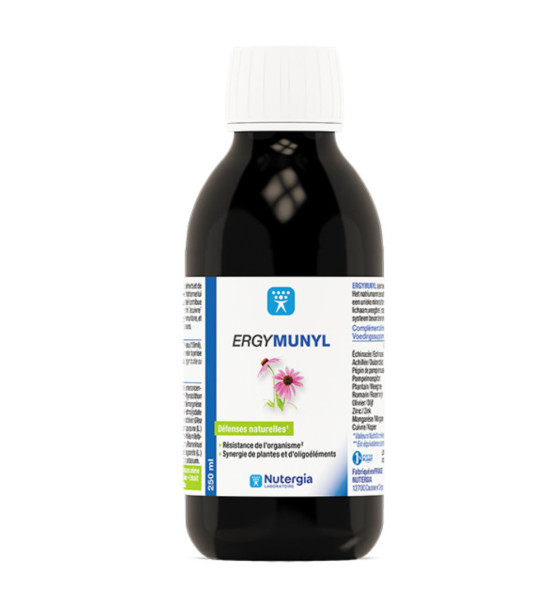 ERGYMUNYL est composé d'échinacée, plantain et romarin, qui sont traditionnellement reconnus pour contribuer à la défense de l'organisme, et d'un extrait de pépins de pamplemousse. Plantain, échinacée, achillée et olivier ont une action au niveau des voies respiratoires. Le cuivre et le zinc soutiennent le système immunitaire.