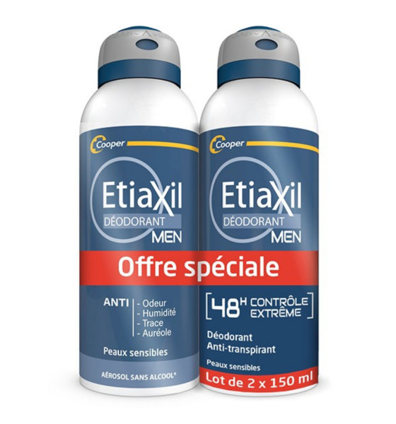 Etiaxil Déodorant Men Anti-Transpirant Contrôle 48H Aérosol Lot de 2 x 150 ml possède une formule à l’efficacité déodorante et anti-transpirante pendant 48H conçue spécialement pour les hommes.
