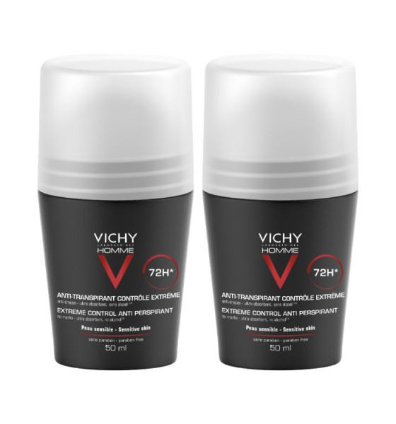 Vichy Homme Déodorant Anti-Transpirant 72h Roll-On et sa formule, riche en Actifs anti-transpirants et en Minéraux ultra-absorbants, régule la transpiration et l'humidité pendant 72h.