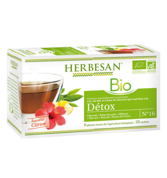 Herbesan Infusion Bio Détox 20 Sachets est une infusion bio aromatisée à base de thé et chicorée, contenant 6 plantes issues de l'agriculture biologique, favorisant la détoxification.