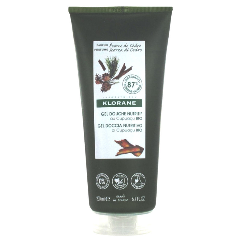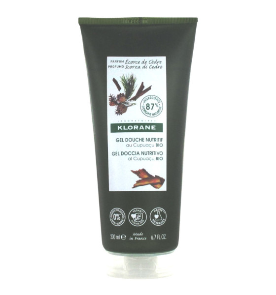 Klorane Gel Douche Nutritif au Cupuaçu Bio Écorce de Cèdre 200 ml est un gel douche à la formule biodégradable et au pH physiologique qui nettoie délicatement et nourrit tous types de peaux. Il offre un parfum délassant aux notes de bois de cèdre, graines de cardamone et d'ambre.
