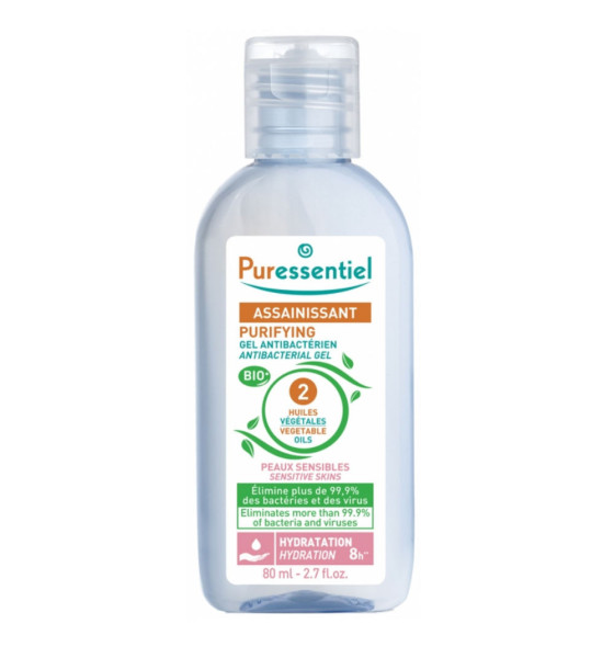 Puressentiel Assainissant Gel Antibactérien aux 2 Huiles Végétales 80 ml est un gel antibactérien sans savon contenant un complexe d'huiles végétales Bio d'amande douce et de ricin et de bisabolol Bio pour assurer la protection des peaux sensibles et réactives. Il offre une hydratation extrême et une hydratation pendant 8 heures.