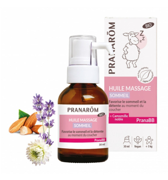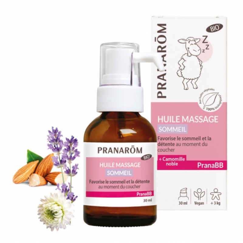 L’huile de massage Sommeil est spécialement adaptée pour le massage relaxant de bébé : elle apaise en douceur et favorise le sommeil paisible ; les huiles végétales de coco, d’amande douce et de tournesol nourrissent la peau sensible de bébé et la protègent ; subtilement enrichie avec les huiles essentielles de Lavande vraie, de Camomille noble , d’Orange douce et de Ravintsara, l’huile de massage Sommeil au doux parfum apaisant crée un moment privilégié de détente et de complicité avec bébé.