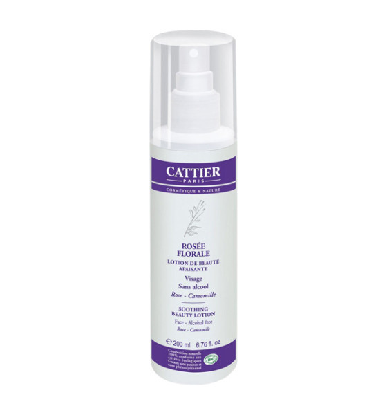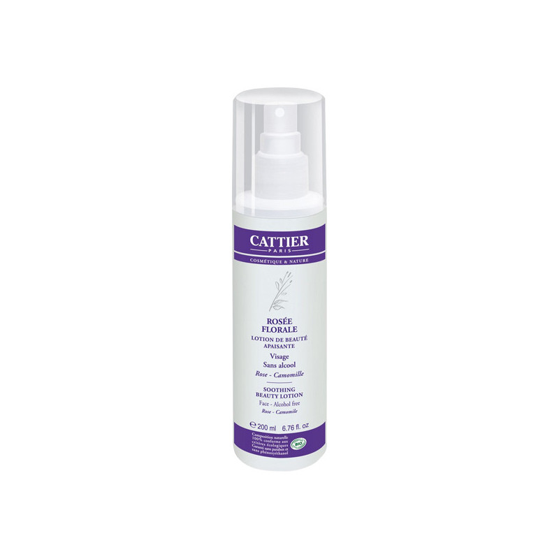 Cattier Rosée Florale Lotion de Beauté Apaisante 200 ml sans alcool apaise, rafraîchit et tonifie la peau pour un teint frais.Cette lotion parfait le démaquillage et réveille l'éclat du teint. Elle apaise et adoucit l'épiderme grâce aux eaux florales bio de rose et de camomille et à l'extrait de calendula bio. Les protéines de blé, puissants actifs hydratants et nourrissants, apportent tonicité et fermeté à la peau. Les huiles essentielles libèrent un délicieux parfum.