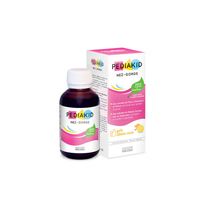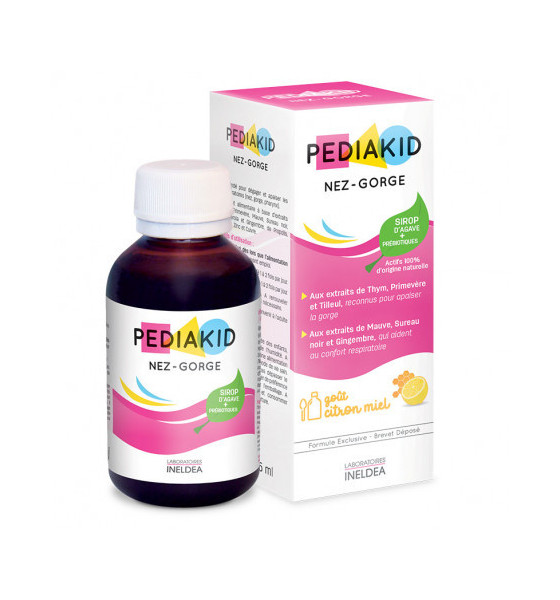 PEDIAKID® Nez-Gorge réunit des actifs naturels pour apaiser et dégager les voies respiratoires (nez, gorge, bronches…), dès les premiers signes. Le Thym, la Primevère et le Tilleul apaisent la gorge. La Mauve, le Sureau noir et le Gingembre améliorent le confort respiratoire. La Vitamine C et le Cuivre participent au fonctionnement du système immunitaire, garant de bonnes défenses naturelles, ce qui est particulièrement important en hiver, saison propice au confinement.