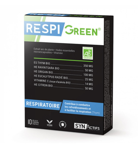 SYNACTIFS RESPIGREEN 10 gélules est un complément alimentaire BIO composé d'une combinaison inédite d'actifs Bio pour offrir le meilleur. RESPIGREEN est une synergie d'huiles essentielles microencapsulées (et donc mieux assimilées), de vitamine C et d'extrait sec de thym. Le thym est connu en phytothérapie pour à la fois combattre les coups de froid et rendre la respiration plus facile. Quant à la vitamine C, elle contribue au fonctionnement normal du système immunitaire pour vous apporter une action de fond.
