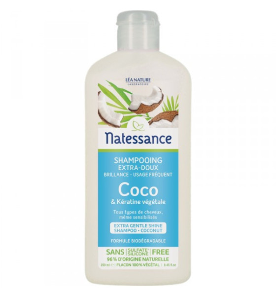 Natessance Shampooing Coco et Kératine Végétale 250 ml est un shampooing à l'huile de coco et à la Kératine, idéal pour le soin des cheveux sensibilisés et fragil