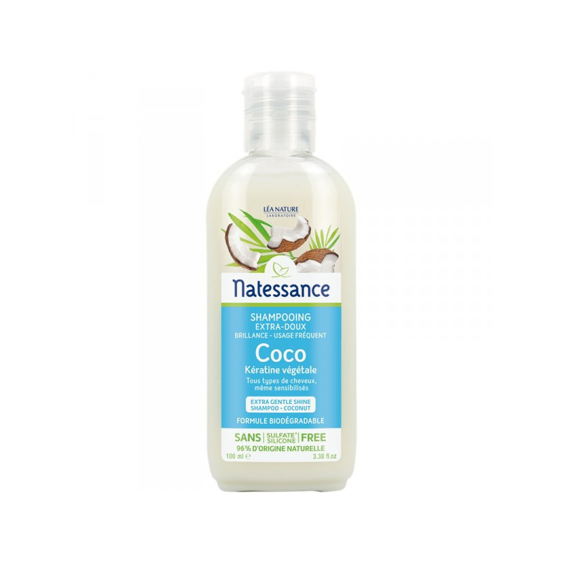 Natessance Shampooing Coco et Kératine Végétale 100 ml est un shampooing à l'huile de coco et à la Kératine, idéal pour le soin des cheveux sensibilisés et fragilisés.