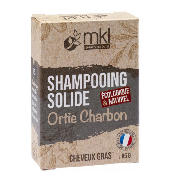 MKL Green Nature Shampoing Solide Ortie Charbon Cheveux Gras 65 g est un shampoing de fabrication artisanale composé de macérat d'Ortie et de Charbon aux vertus apaisantes, purifiantes et détoxifiantes. Idéal pour les cheveux gras. Sa formule est naturelle et écologique pour une utilisation longue durée.