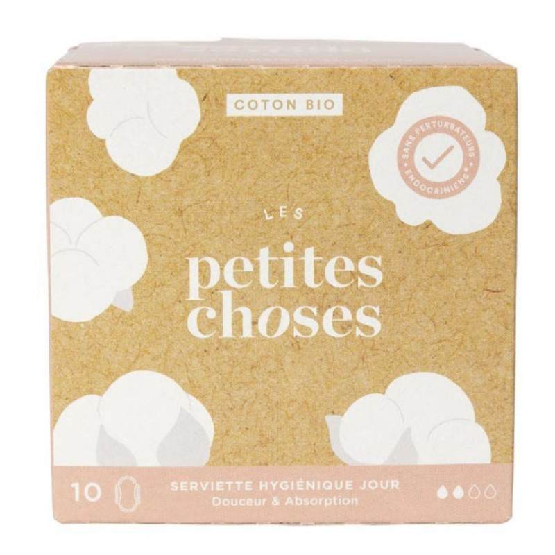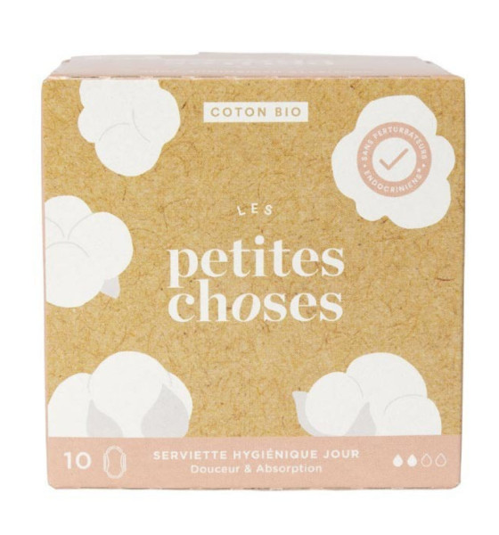 Les Petites Choses Serviettes Hygiéniques Jour Coton Bio 10 unités sont produites à base de coton 100% bio et de composants biodégradables afin de garantir douceur, hygiène mais également sécurité et protection de l'environnement.