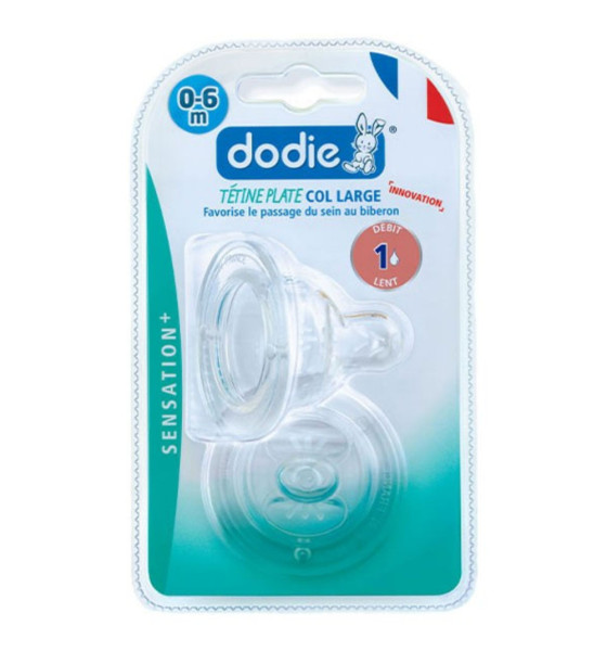 Dodie Sensation+ 2 Tétines Plate Col Large 6 Mois et + Débit 3 Rapide est une tétine à débit rapide qui reproduit la forme aplatie du sein pendant la tétée.