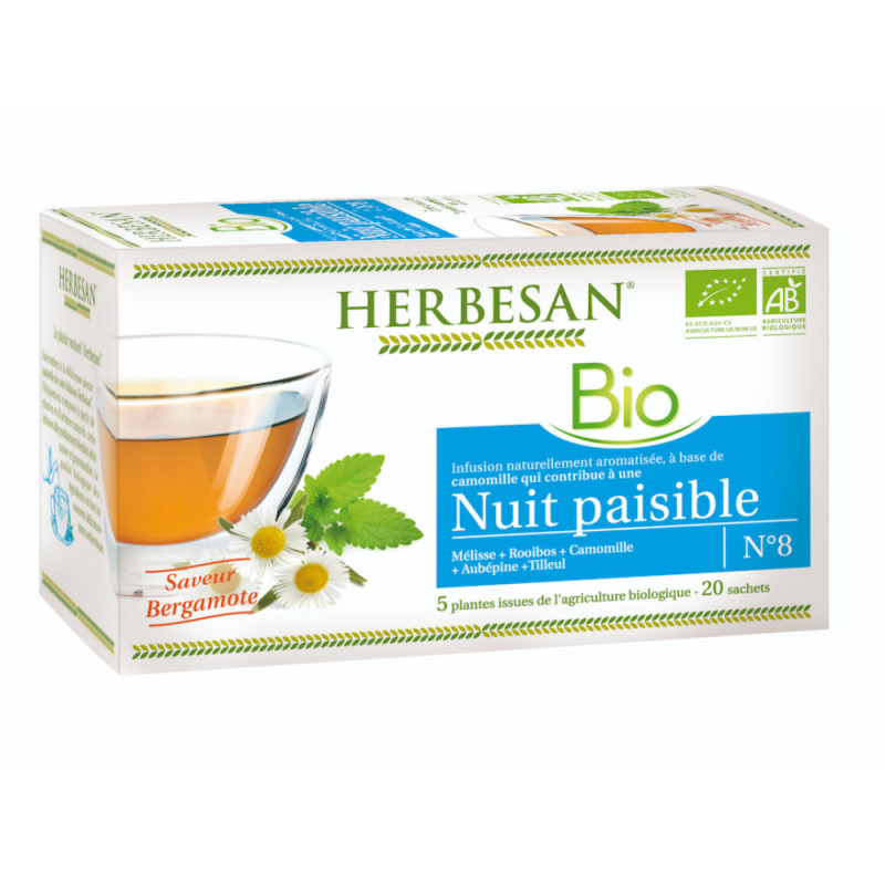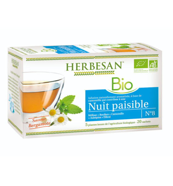 Herbesan Infusion Bio Nuit Paisible 20 Sachets est une infusion bio naturellement aromatisée, à base de Camomille qui contribue à une nuit paisible.